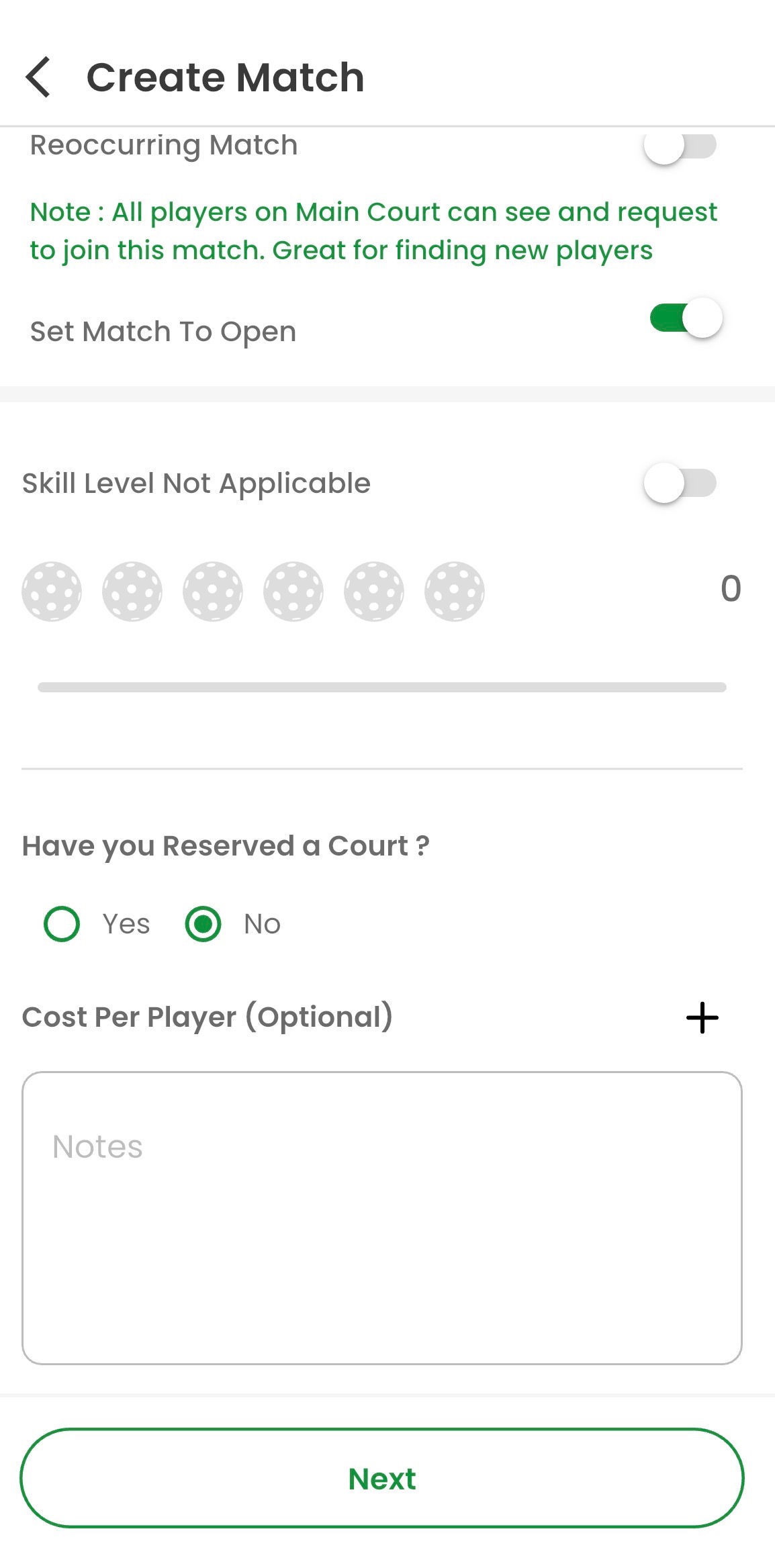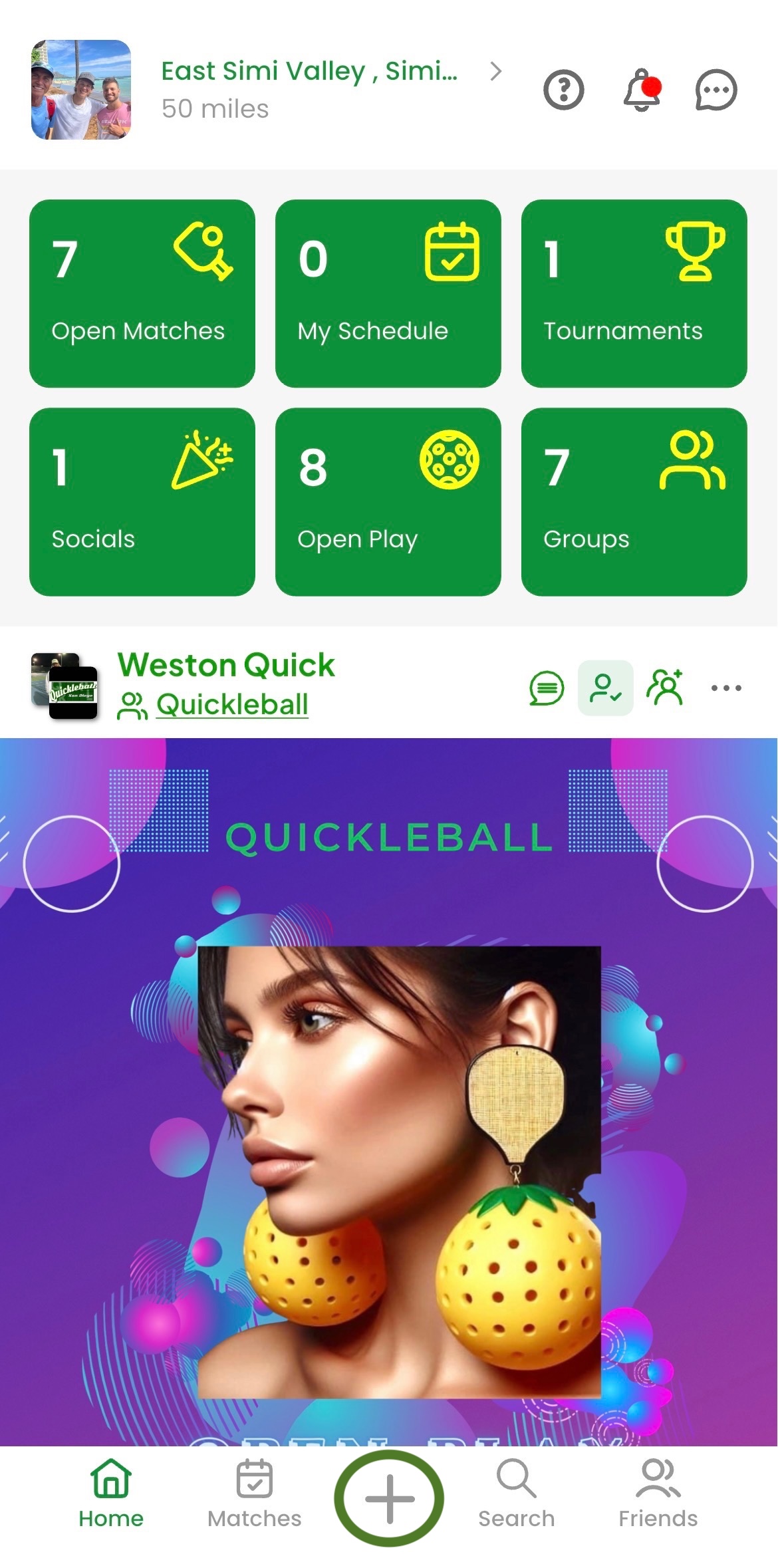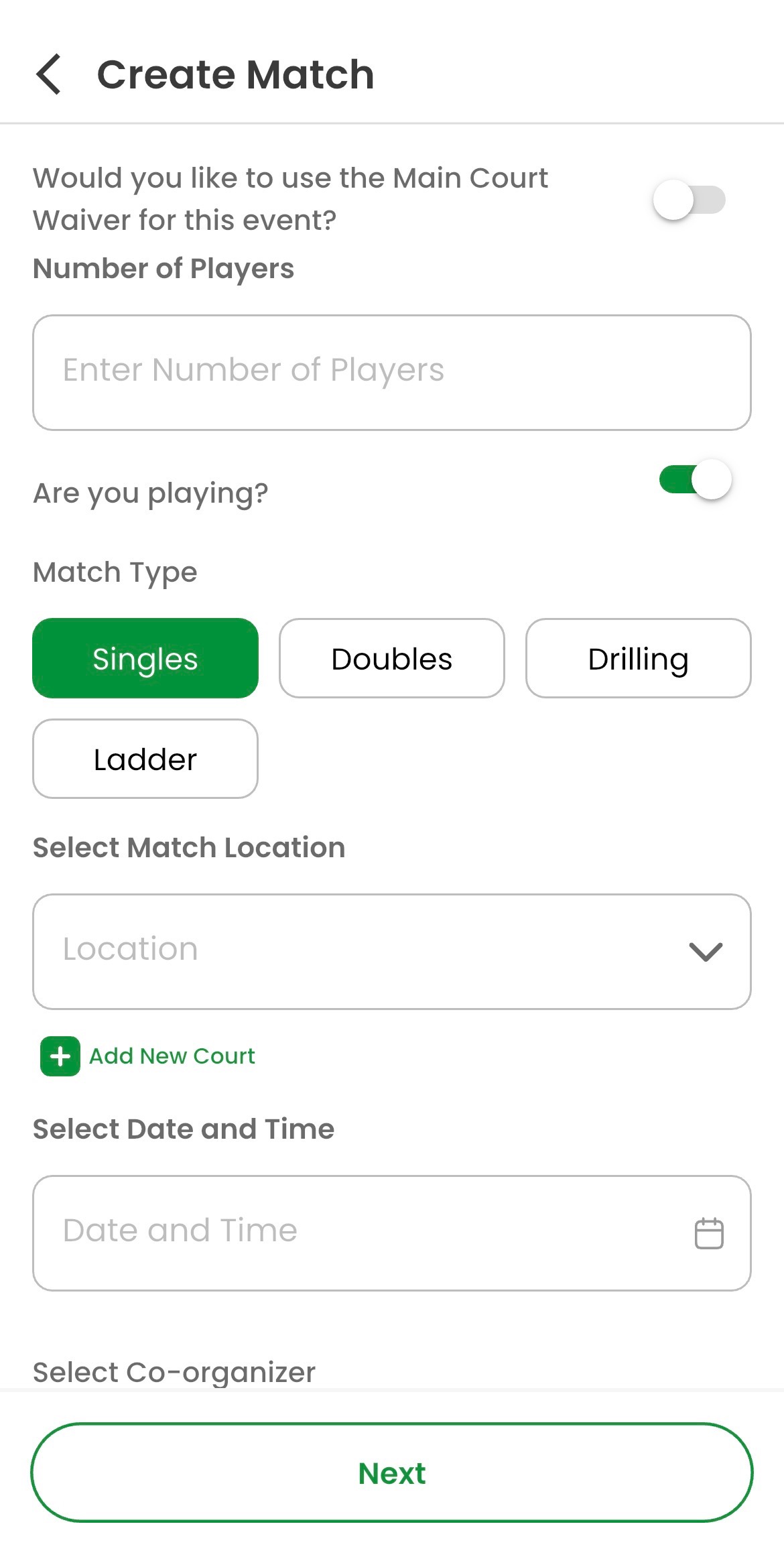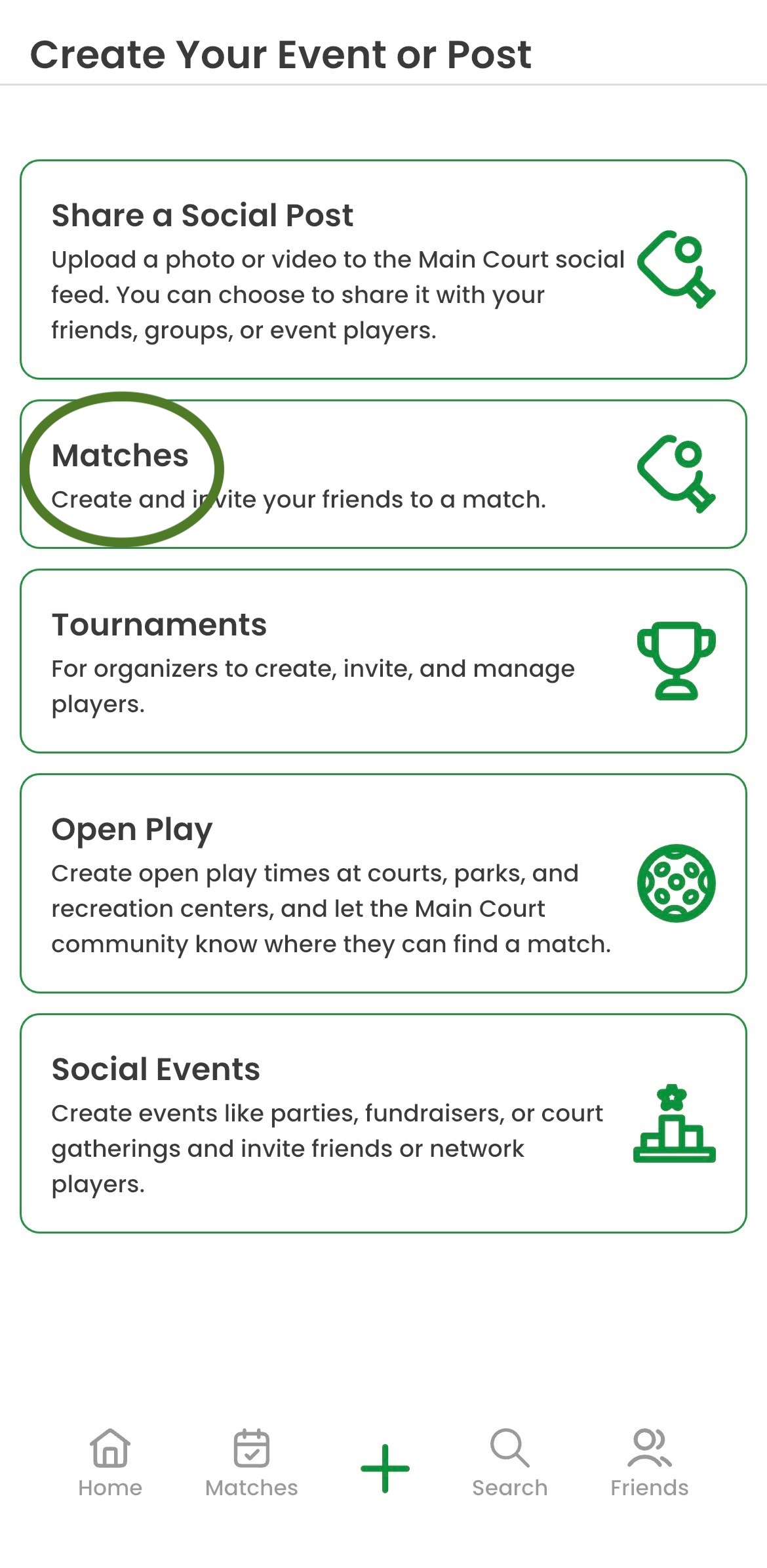 To create a match, tap the + button at the bottom of Main Court and select Match.