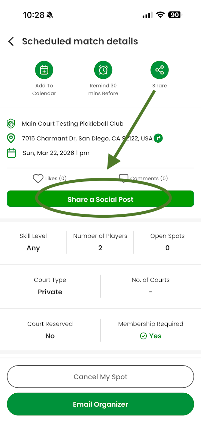Instead of waiting for invites alone, your post reaches your friends, giving you another avenue to reach them. You can also create a collab post with your co-organizers or the club you're running the match or event at for more visibility.