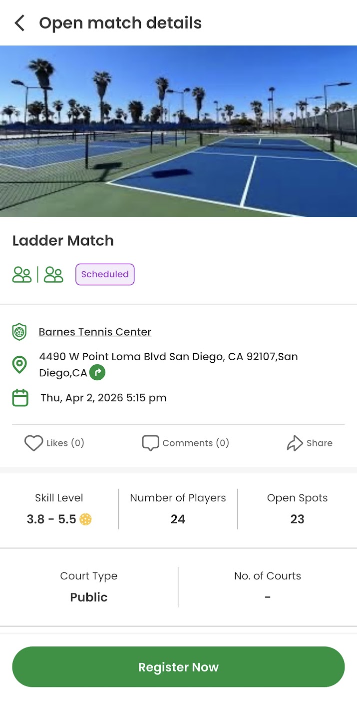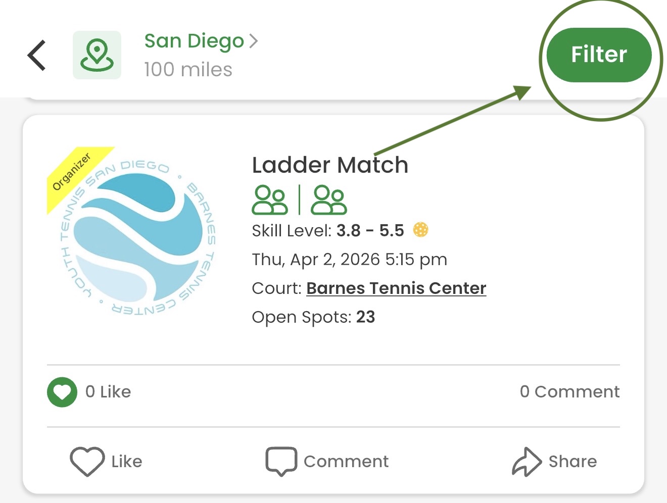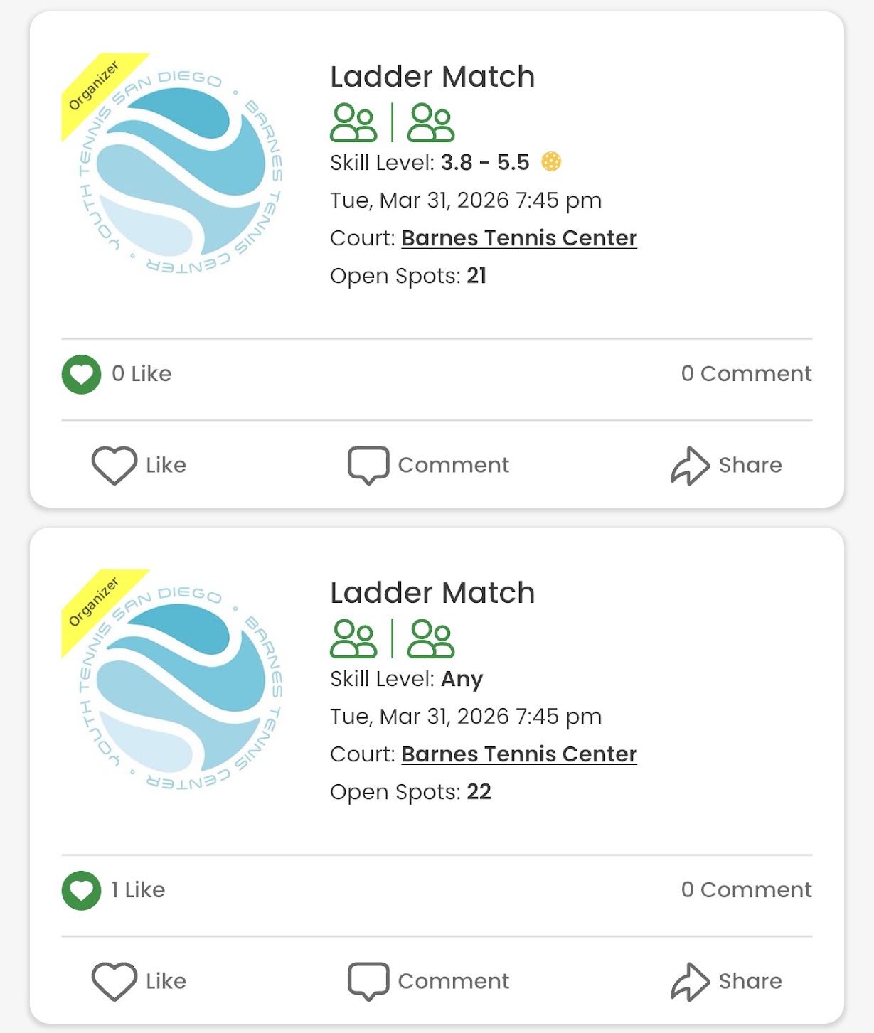 • This allows you to find nearby matches, open plays, social events and tournaments, including the ladder matches at Barnes Tennis Center