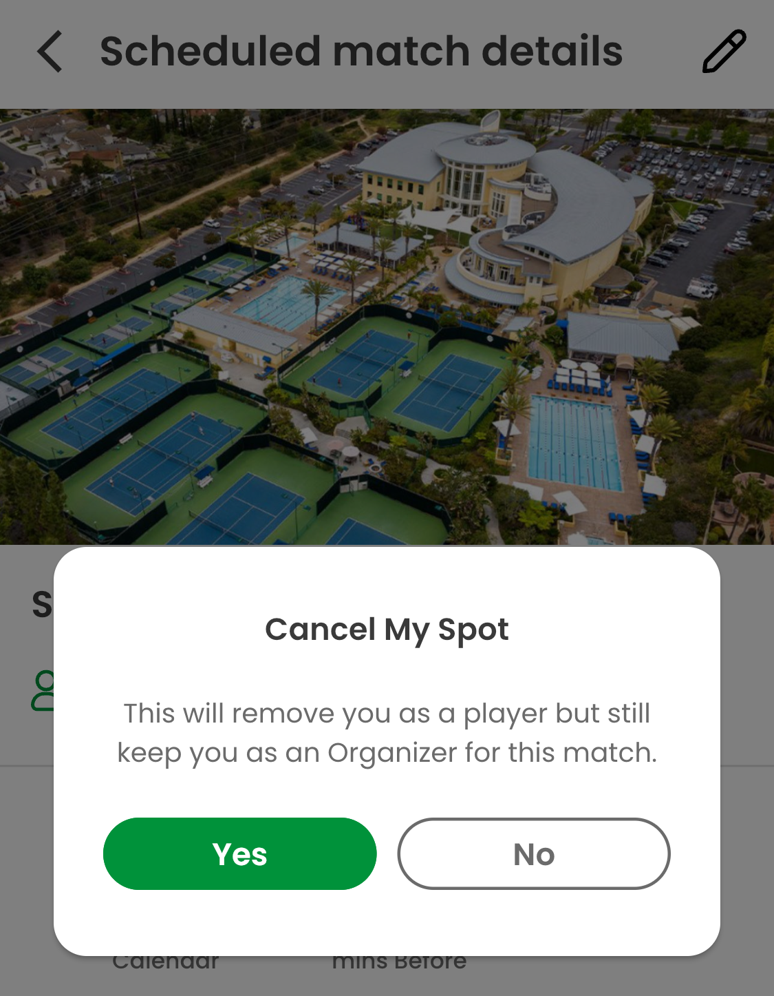 Step 4: Upon doing so, you will receive an immediate confirmation that your reserved spot has been successfully canceled. Additionally, the organizer of the match will automatically receive a notification informing them of your cancellation. If you are the organizer of the match, you will be prompted to confirm your cancellation as a participant. This confirmation allows you to step back from participating while still maintaining your role as the organizer of the match.