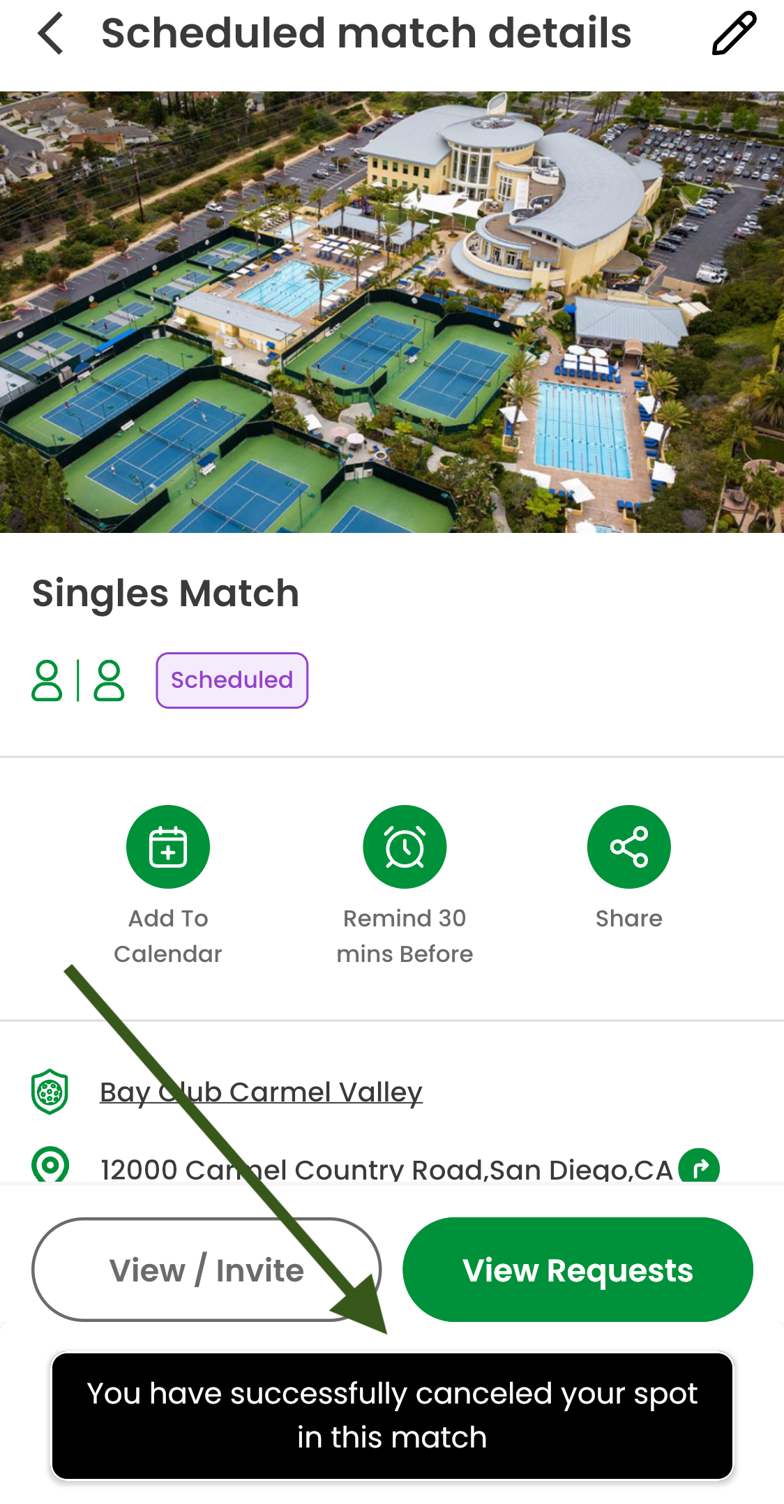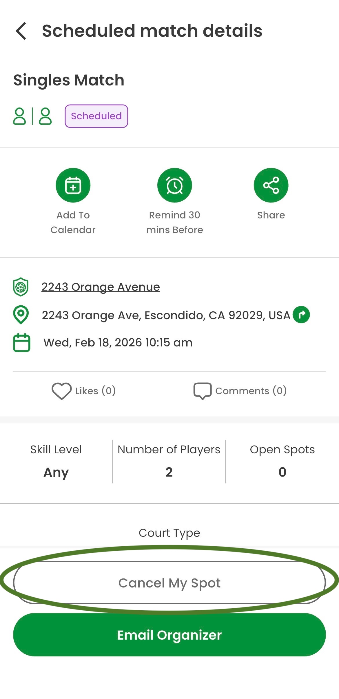 Main Court makes canceling your spot in a match or event as simple and convenient as reserving it. The process is consistent whether you cancel your spot in a match or an upcoming event, such as a tournament or social event.