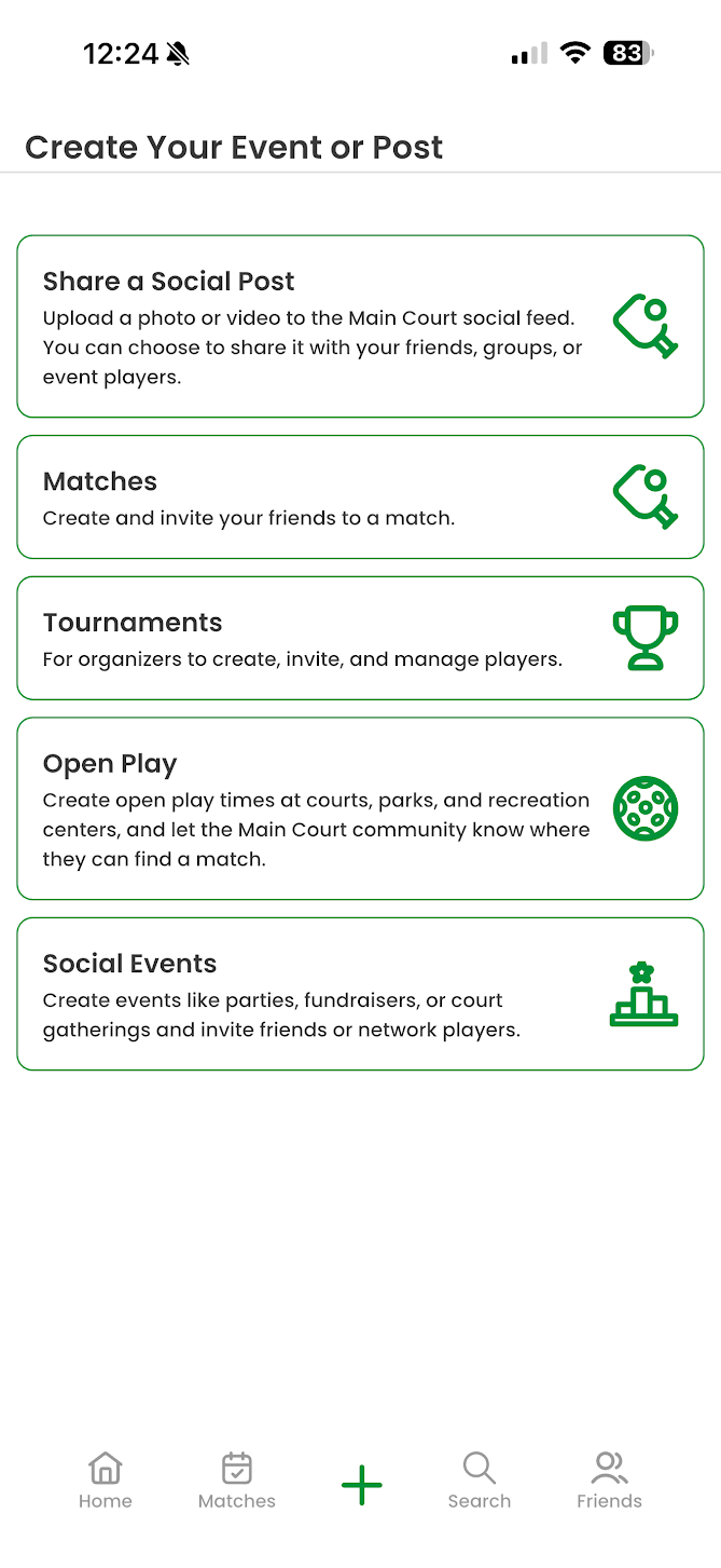Main Court lets you create and explore six types of events directly in the app, with easy listing tools and location-based discovery to help you reach players nearby.