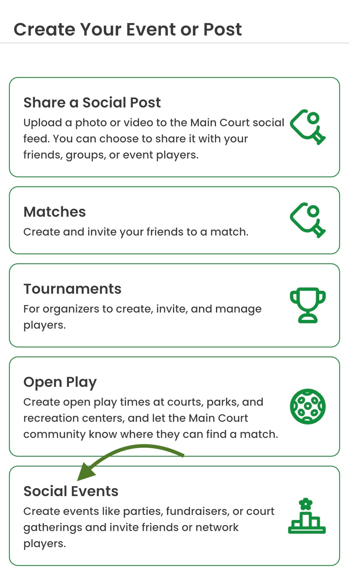 Social Events can be free or include a cost for participants, depending on the organizer's preferences. Follow these steps to create a new Social Event and engage with the Main Court community.