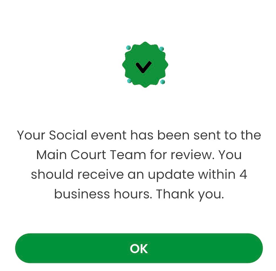 Step 6: Get Approved! After you create your Social Event details and invites, you Social Event will be sent in to the Main Court Team for approval.